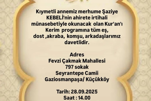 Şenpazar Korucak Mahallesi'nden Güngör Kebeli ve Gürkan Kebeli' nın anneleri merhume Şaziye Kebeli' nin ahirete intikali...
